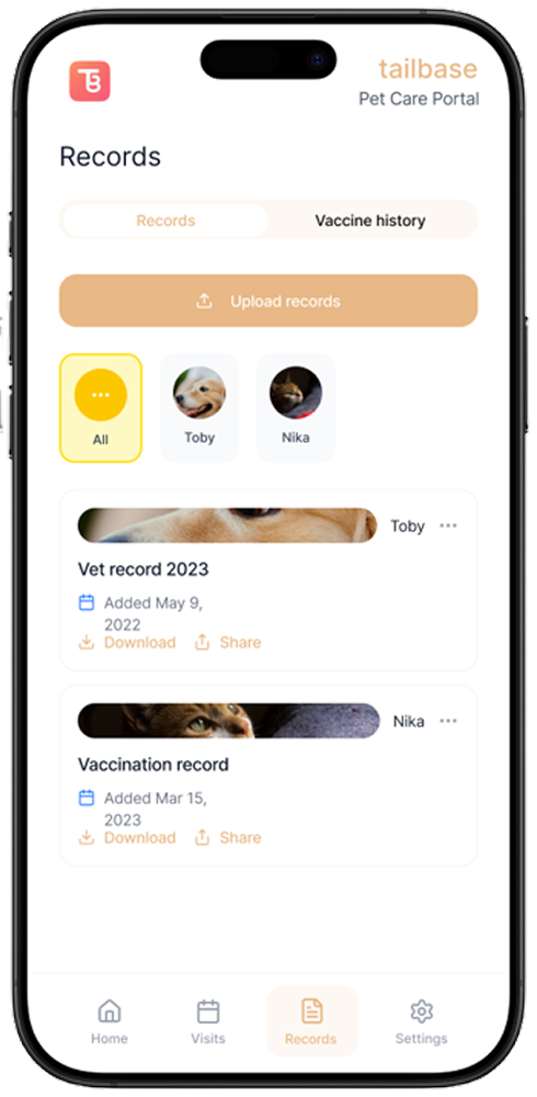 You can request and transfer records directly in the app. Tailbase is also integrating with clinics for seamless syncing.